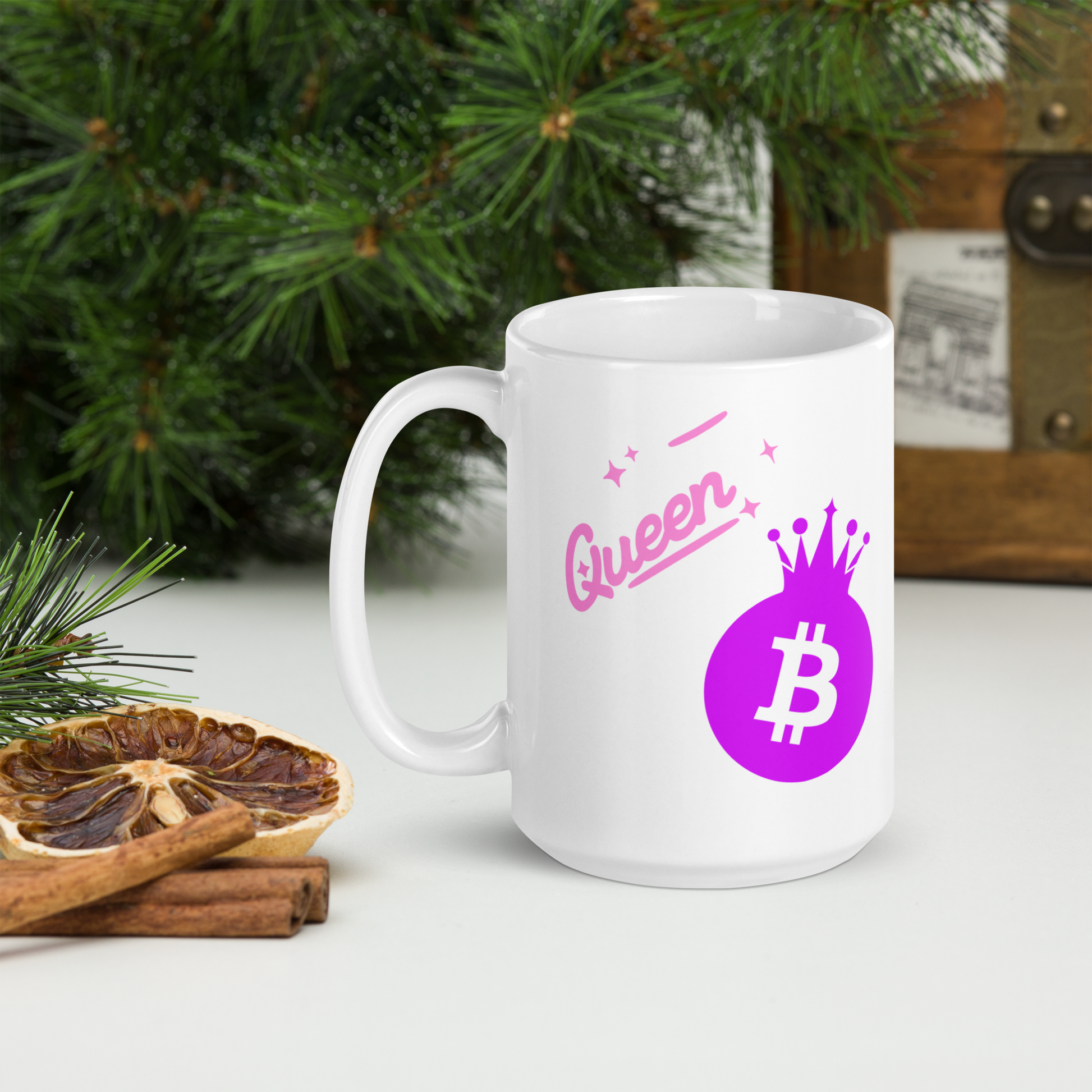 weiße glänzende Tasse Bitcoin Queen B Krypto lustiges Geschenk BTC Blockchain Frauen